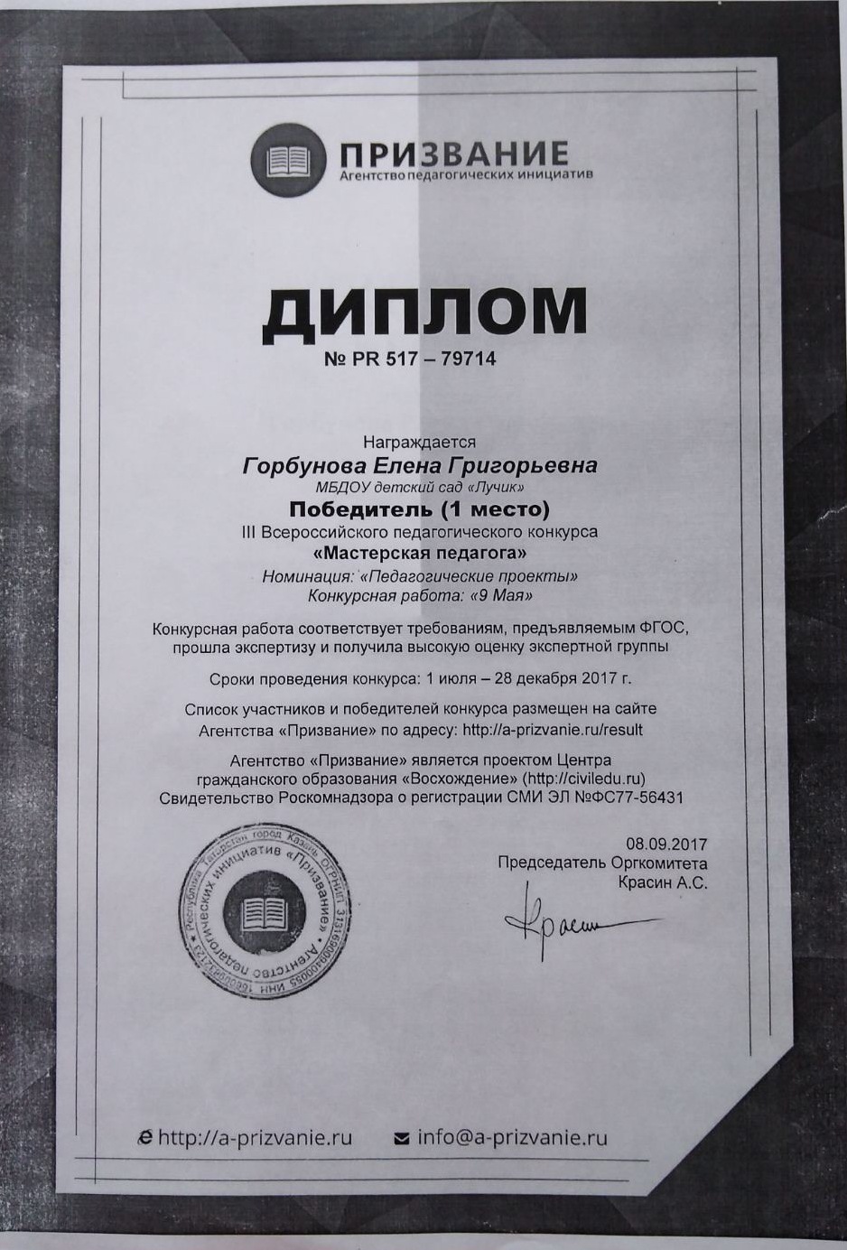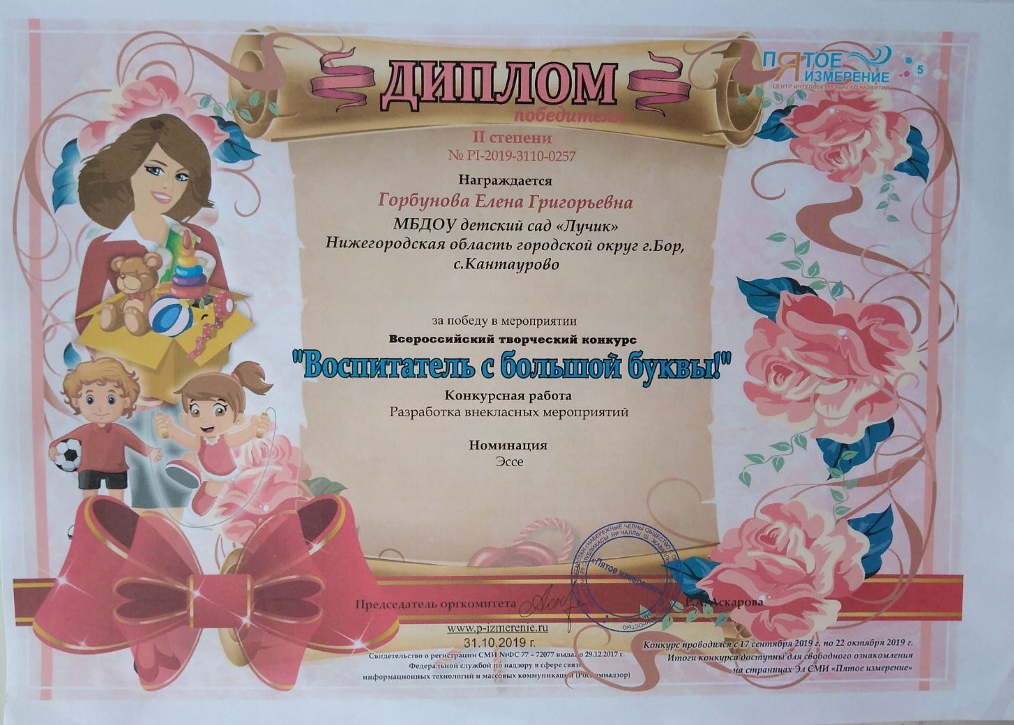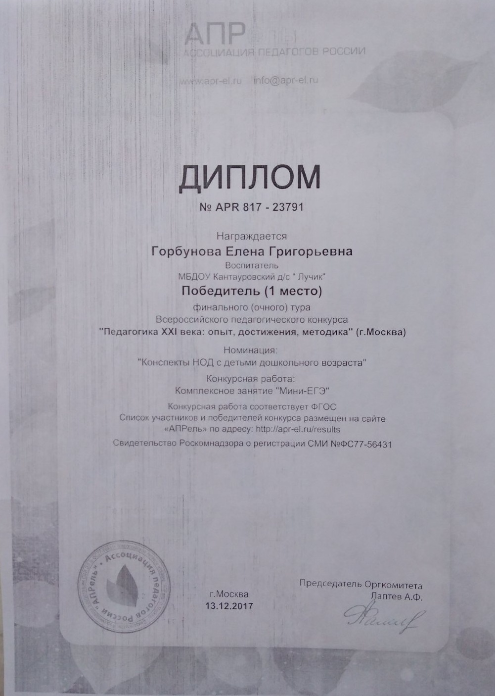 Наименование направления подготовки и (или) специальности: преподаватель по специальности Дошкольная педагогика и психология
