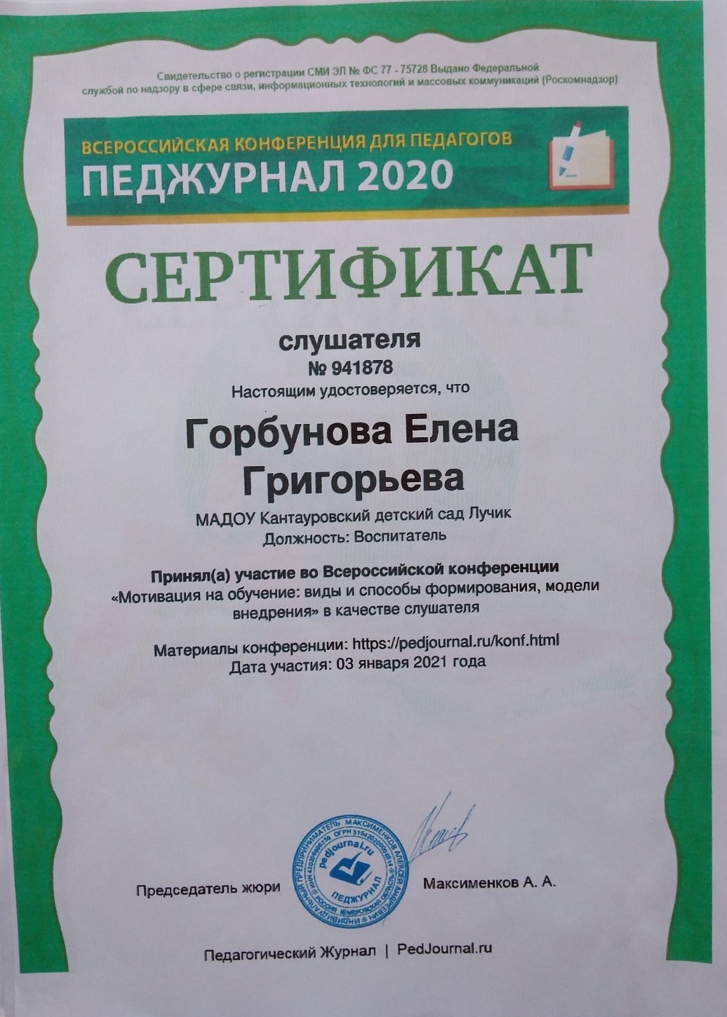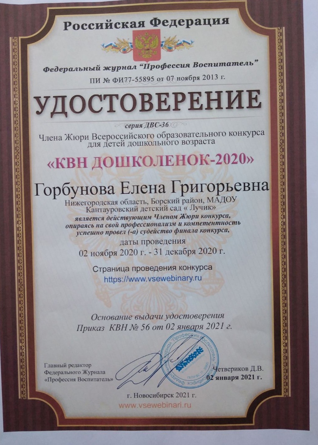 Квалификация: Высшая,кв.категория 2021 г.