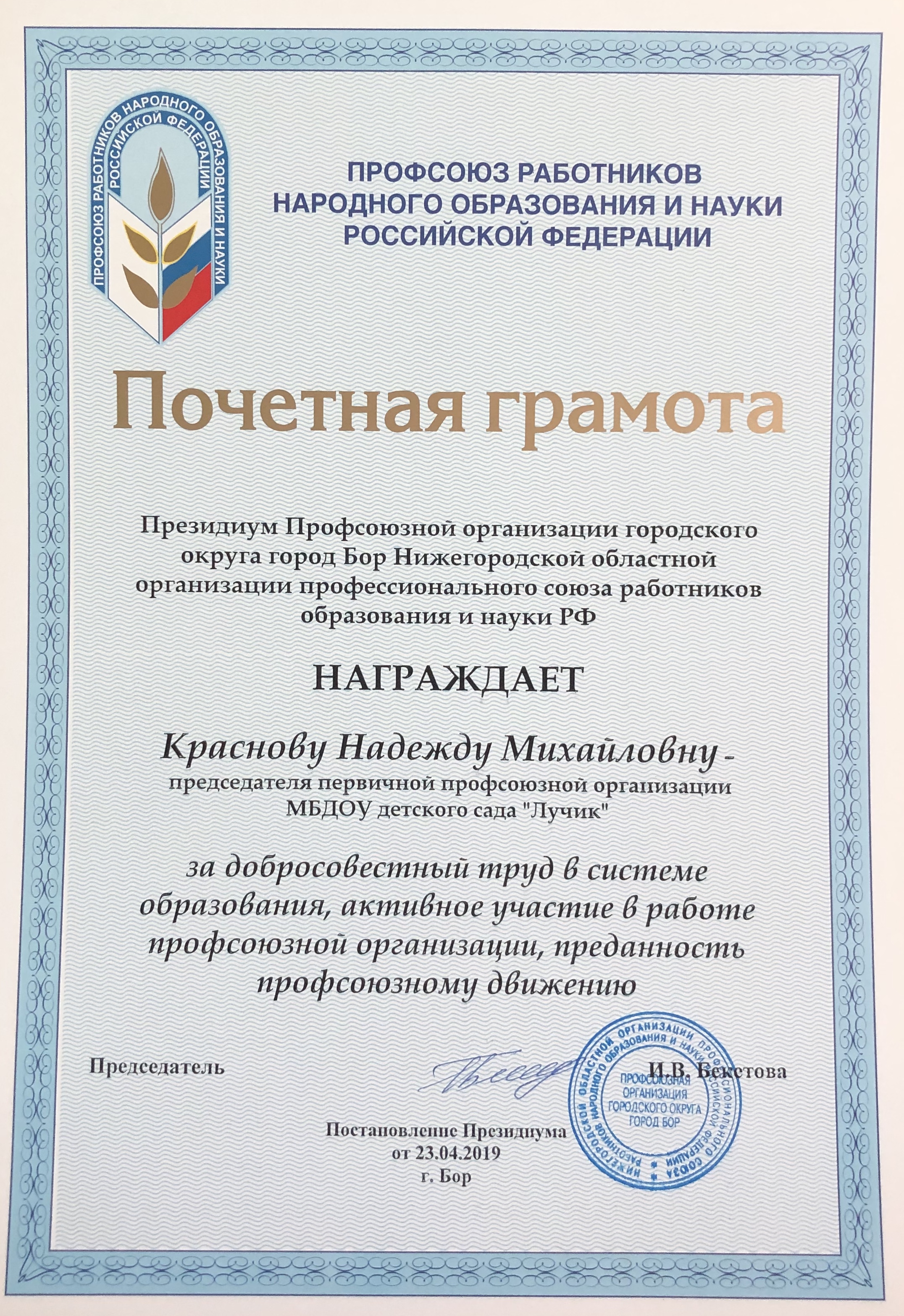 Председатель Профсоюзной организации работников народного образования г.о.г.Бор –